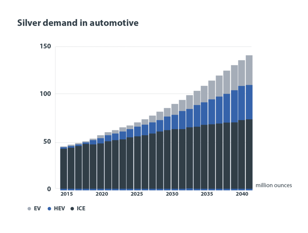 Every EV is a silver-intensive machine. Between inverters, chargers, relays, and sensors, each vehicle uses 25–50 grams of silver24 — and that number keeps rising as onboard electronics become more advanced.