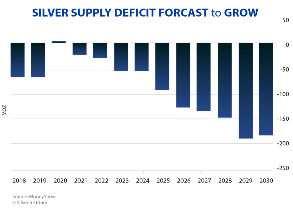 “Global demand for silver has created the biggest deficit in decades.” And the Silver Institute expects the shortfall to keep growing into 2030.